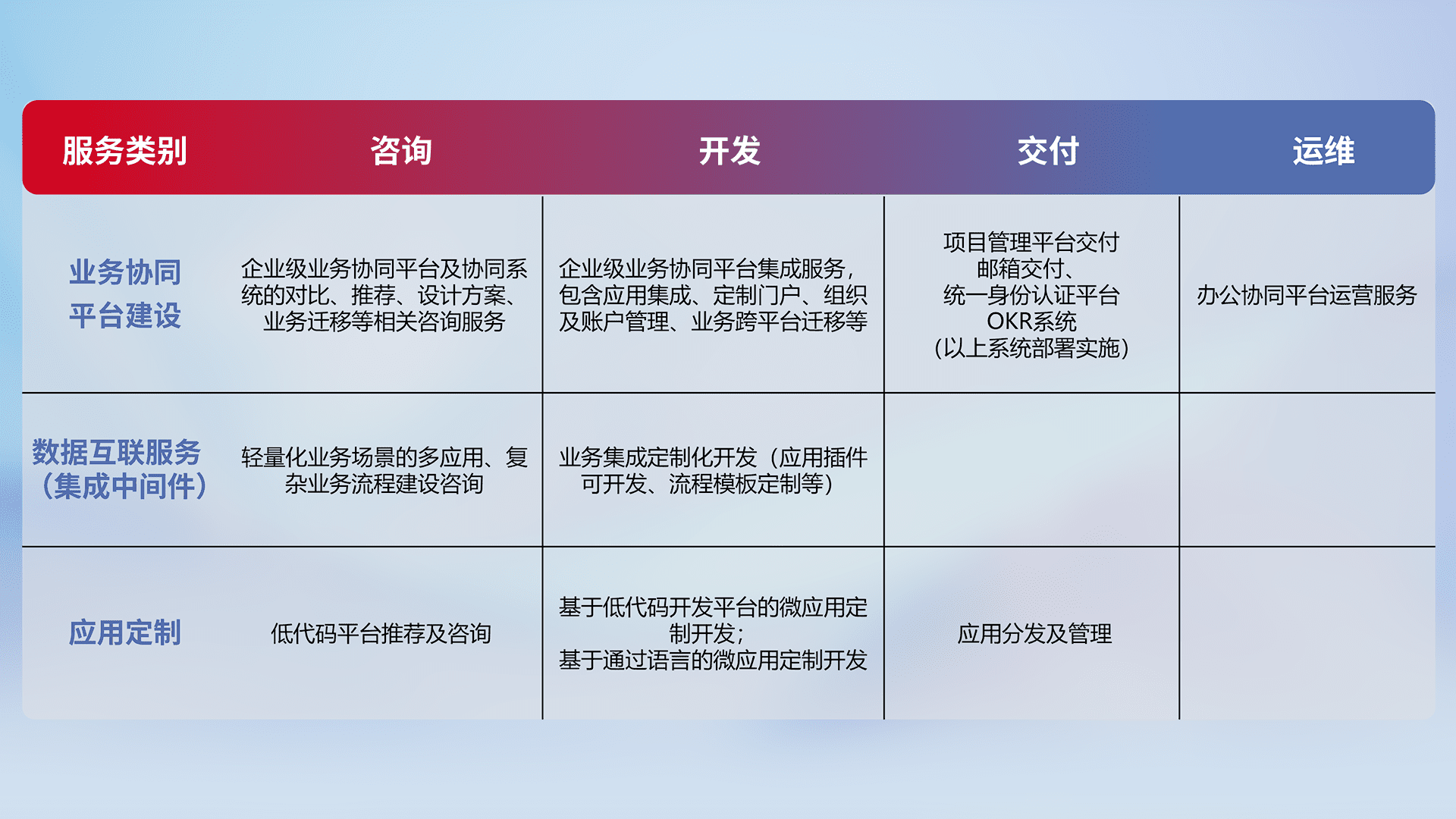 针对钉钉、、、、企微、、IDaas等平台级产品提供产品的规划、、方案、、交付、、定制化开发等服务,,实现如统一协同办公、、智能客户服务、、、混合会议管理、、、、智能数据查询、、等业务场景,,,,实现数字化转型。。